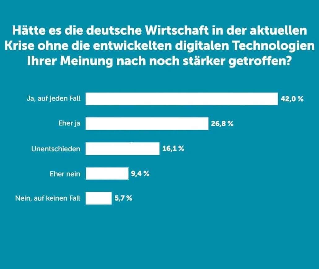 Unternehmen aus der IT-Branche gelten als der Motor in der aktuellen Krise und halten die deutsche Wirtschaft am Laufen – diese Meinung teilt auch ein Großteil der Bevölkerung. In einer von Eco beauftragten repräsentativen Civey-Umfrage sind knapp 70 Prozent der Befragten der Auffassung, dass es die deutsche Wirtschaft in der aktuellen Krise ohne digitale Technologien noch stärker getroffen hätte.