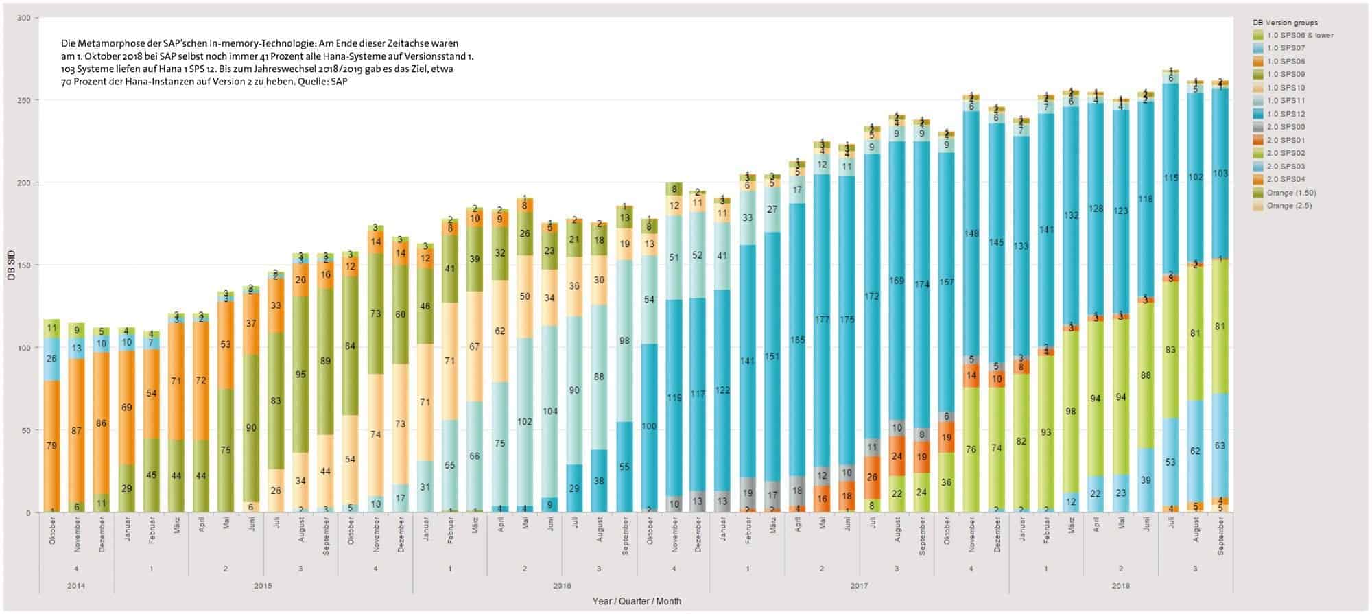 Die Grafik auf der folgenden Seite zeigt über der Zeitachse die unterschiedlichen Hana-Implementierungen bei SAP selbst. Überraschend ist nicht nur die hohe Anzahl an sehr unterschiedlichen Versionsständen, sondern auch die Tatsache, dass am 1. Oktober vergangenen Jahres bei SAP noch 41 Prozent aller Hana-Systeme der Version 1 zuzurechnen waren.