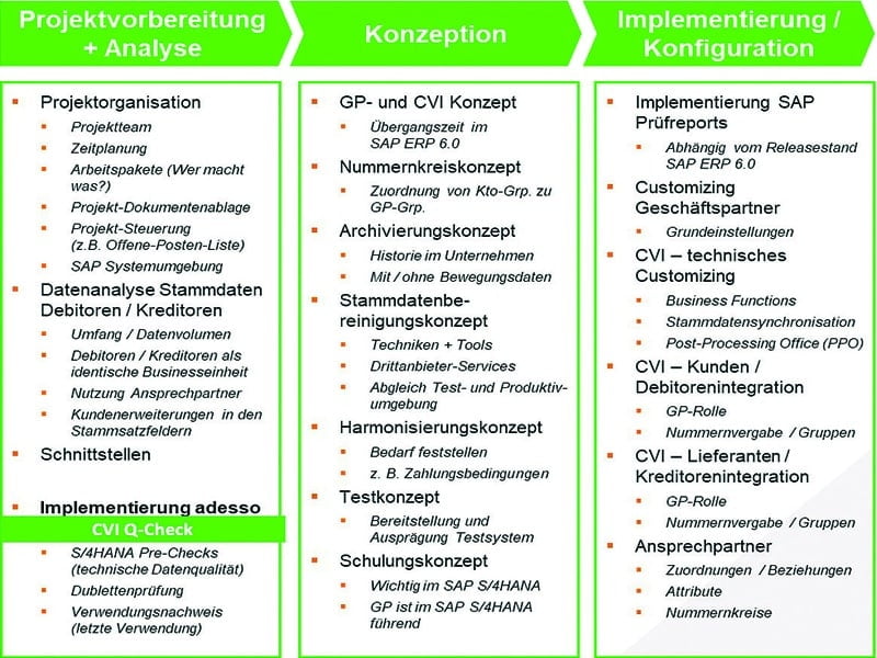 Unser Vorgehensmodell zur Business-Partner-Umstellung integriert die Evaluation der Stammdaten gleich in die erste Phase unseres Vorgehensmodells „Projektvorbereitung und Analyse“. Basierend auf den Erkenntnissen kann das Business-Partner-Umstellungsprojekt ohne weitere Risiken geplant und die Auslastung der Fach-bereiche für die Datensäuberung frühzeitig bestimmt werden. Nachdem die Fachbereiche die Bereinigung der Stammdaten abgeschlossen haben, findet die Business-Partner-Umstellung entsprechend dem Adesso-Vorgehensmodell mit den weiteren Projektphasen seine Fortsetzung.