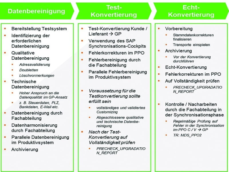 Diese Fragen können ohne vorherige Evaluation der Stammdaten nicht zufriedenstellend beantwortet werden. Die richtigen Antworten auf diese Fragen beeinflussen jedoch den Aufwand der Fachbereiche für die Stammdatenbereinigung (Data Cleansing) und den unterbrechungsfreien Ablauf des Gesamtprojektplans für die -Geschäftspartnerumstellung in ECC.