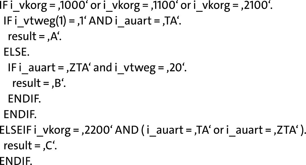 Das Gute an Unit-Tests ist: Sie können nachträglich zu einer Klasse definiert werden, ohne die Logik der Klasse selbst zu beeinflussen. Ich kann also beispielsweise einen Unit-Test für folgende Konstellation erstellen: Stelle sicher, dass bei der Behauptung (engl.: assert) i_vkorg = ‚1000‘, i_vtweg = ’10‘ und i_auart = ‚TA‘ der Wert „A“ herauskommt. Das Ergebnis dieser Behauptung kann ich mit einem Tastendruck verifizieren.
