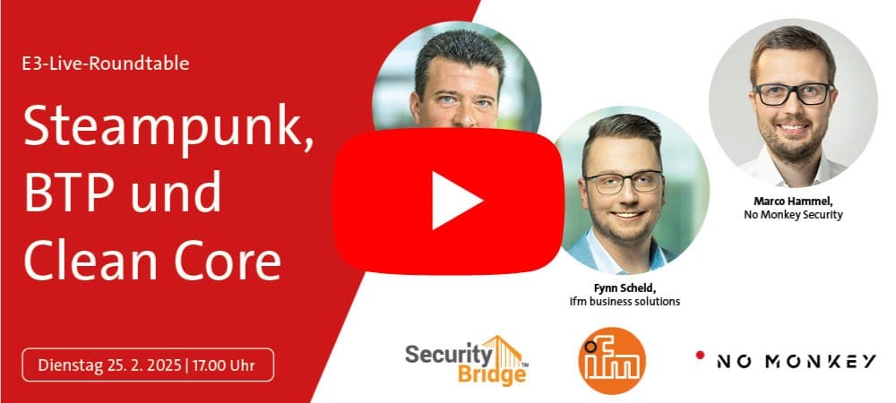 Les plates-formes sont le nouveau mantra de la communauté informatique. Certainement moins sacrées, mais utiles pour surmonter le chaos des interfaces de ces dernières années. Outre les mots-clés connus tels que cloud, GenAI, blockchain et IA, la scène SAP en particulier est saisie par une mission de consolidation : Il s'agit d'éliminer les péchés informatiques des jours ERP passés. De nombreuses modifications et négligences en matière de sécurité doivent être réparées : Dans cette table ronde de l'E3, les notions de "sécurité" et de "SAP Clean Core" sont donc au premier plan. Nous discuterons de Clean Core et de sécurité avec Fynn Scheld (ifm business solutions), Holger Hügel (Security Bridge) et Marco Hammel (No Monkey Security).