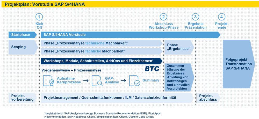Les valeurs de points déterminées dans la matrice de scoring donnent un modèle de décision à différents niveaux - différencié selon l'environnement système, les processus commerciaux, les interfaces, les données de base et les données de mouvement, les add-ons/modifications. Le résultat de l'étude préliminaire est un profil de transformation compréhensible pour l'entreprise concernée - précisément hiérarchisé et pondéré selon le type de greenfield ou brownfield.